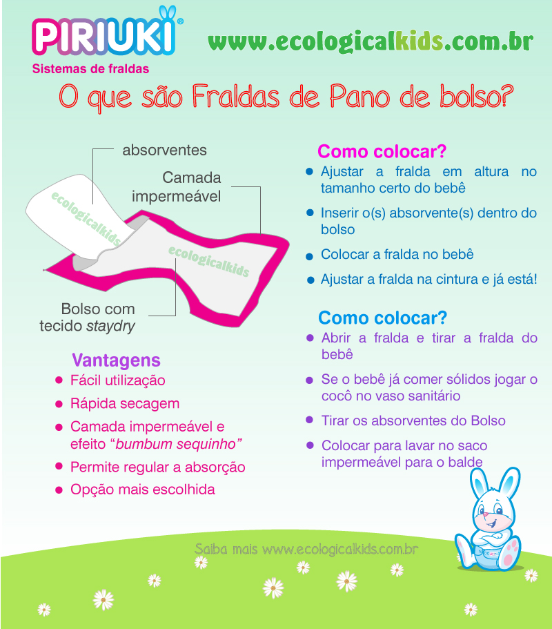 O bolso permite igualmente afastar o xixi do bebê pois o tecido de contato com a pele vai se manter seco (caso o tecido seja stay dry) ficando o xixi retido no absorvente, desta forma aumentamos o conforto do bebê, como é o caso das fraldas Blueberry Deluxe, Piriuki V3, Piriuki Night, Bumgenius 4.0, Blueberry Minky, Charlie Banana, Piriuki Luxe